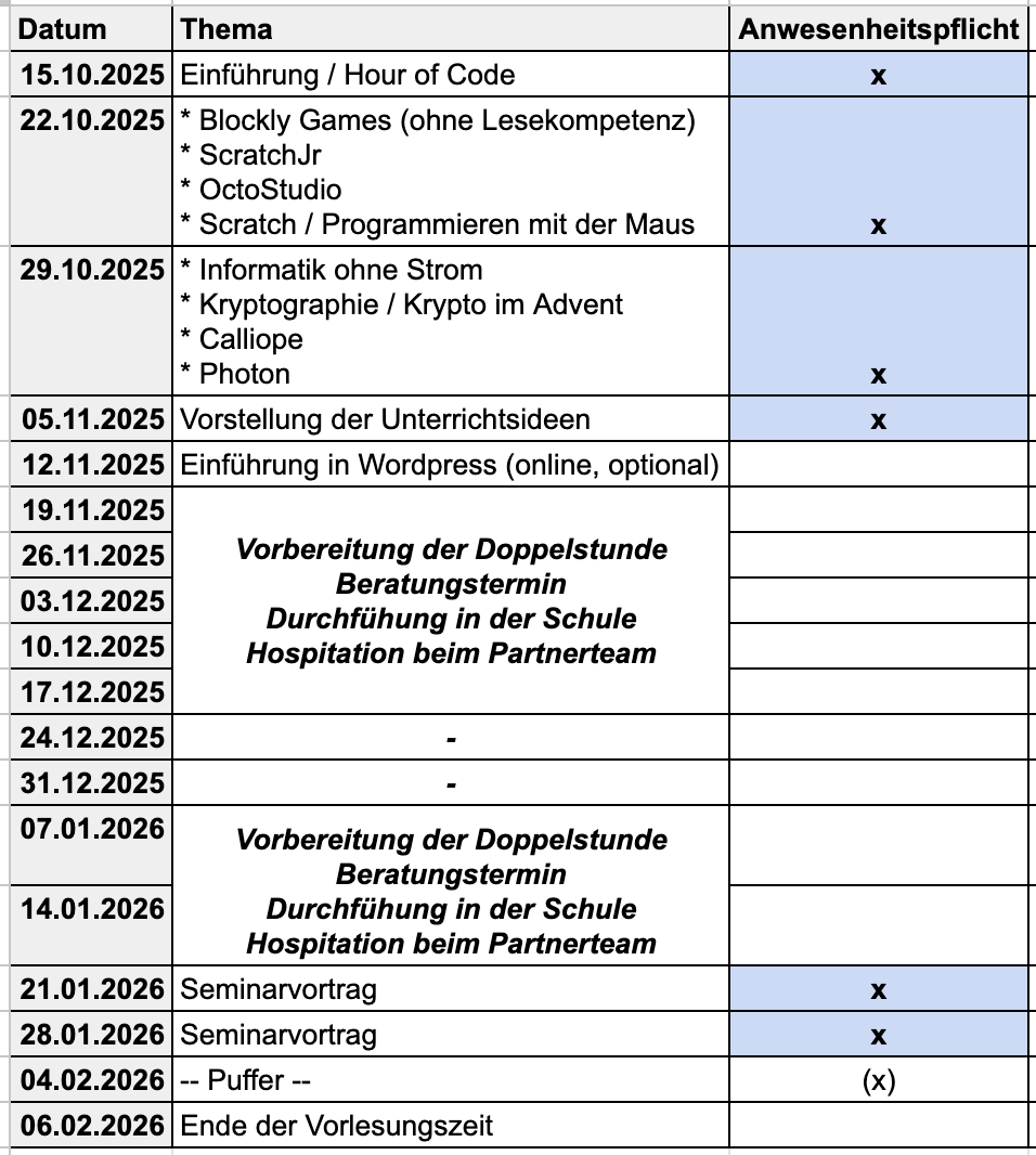 - Selbststudium: Erarbeitung einer Doppelstunde, die einen informatischen Inhalt mit einem anderen Fach verbindet (Beim Seminar „Informatische Bildung“ muss das Mathematik sein)