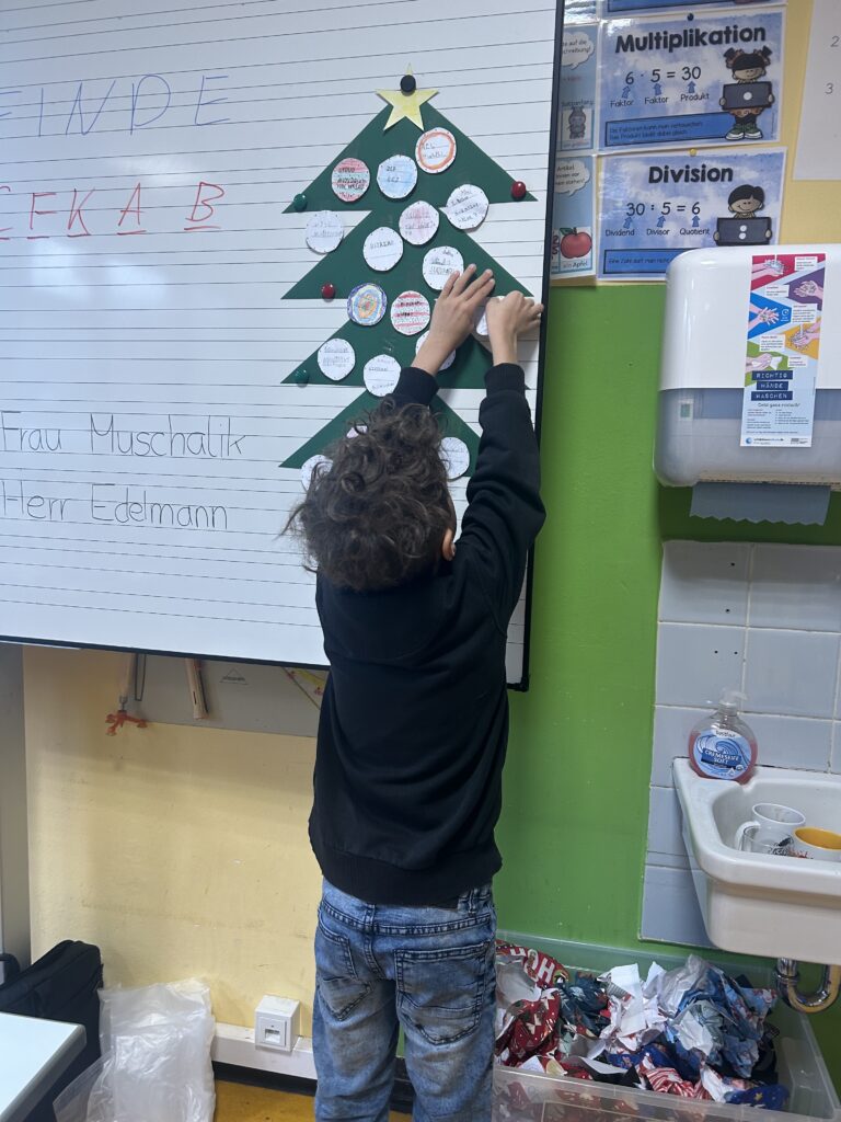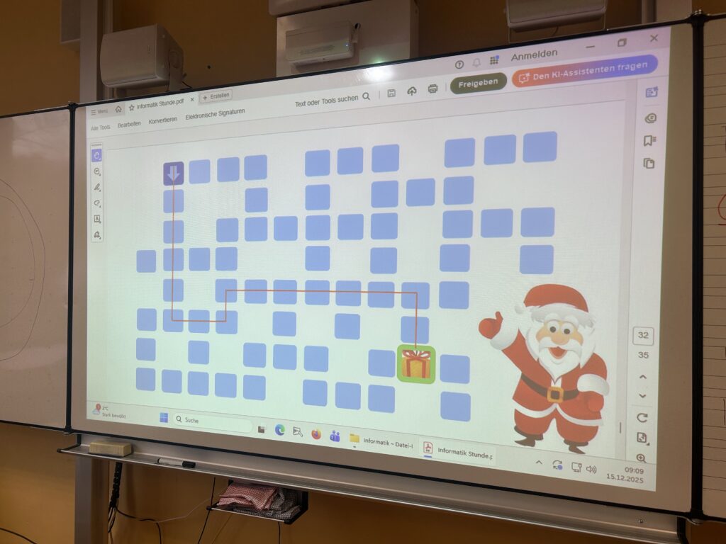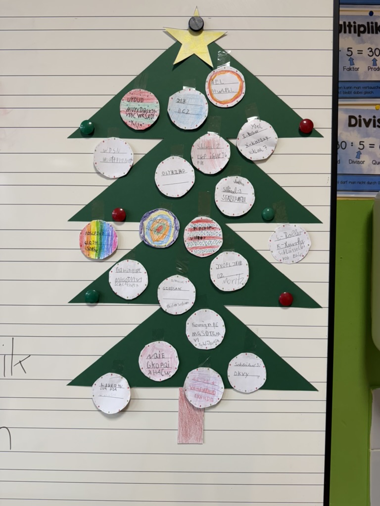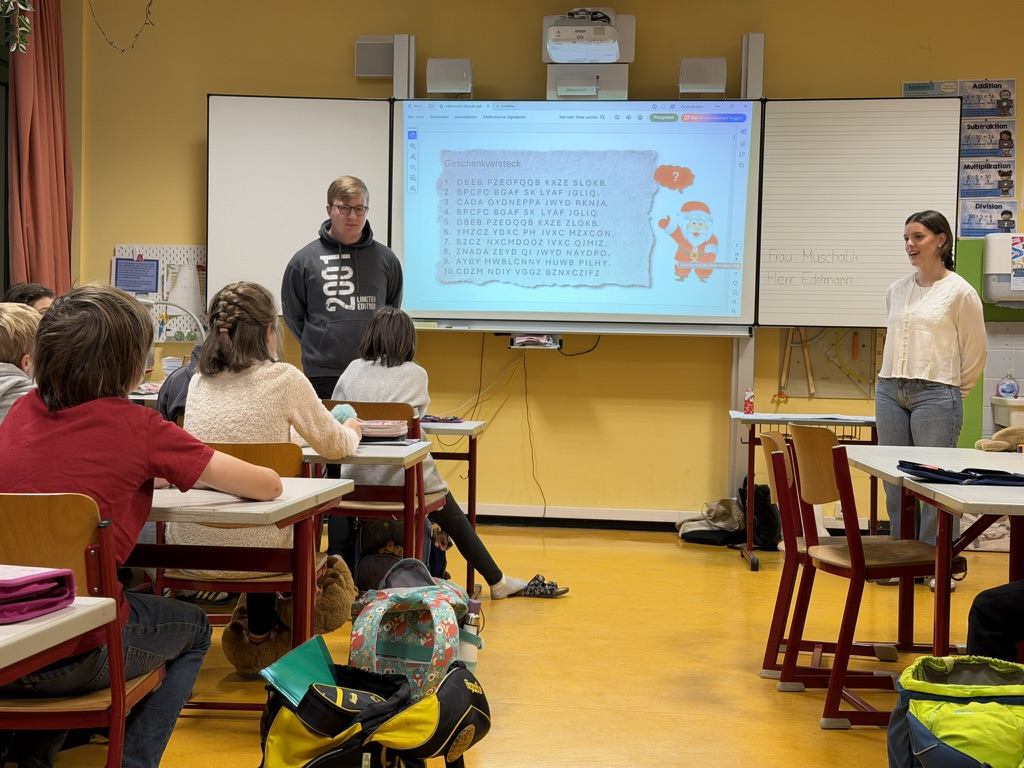 Unsere Unterrichtsstunde durften wir in einer 4. Klasse der Südschule St. Ingbert halten. Unser Thema war die Cäsar-Verschlüsselung und das analoge Programmieren. Die Kinder wurden mithilfe einer Dokumentenkamera und eines vorbereiteten Arbeitsblattes in das Thema eingeführt. Das Ziel der Stunde war es, mit den Kindern zusammen die Geschenke des Weihnachtsmannes zu finden, welche anhand eines entschlüsselten Textes gefunden werden konnten. Als die Kinder entschlüsseln als auch verschlüsseln konnten, wurden sie in Gruppen eingeteilt und durften die geheimen Nachrichten selbst entschlüsseln. Mit Rechenaufgaben wurden die Kinder auch in ihrer Rechenkompetenz geschult. Als alle Kinder fertig waren, durften sie die entschlüsselten Befehle auf dem Labyrinth anwenden. Dabei durften die Kinder den Weihnachtsmann bewegen und die anderen Kinder haben überprüft, ob die Befehle richtig ausgeführt wurden. Die Kinder haben die Geschenke gefunden und wurden mit einer kleinen Süßigkeit belohnt. Danach durften die Kinder noch eine Weihnachtskugel mit dem verschlüsselten Weihnachtswunsch gestalten, welche dann an einen gebastelten Weihnachtsbaum geklebt wurde. Am Ende testeten die Kinder noch ihr Wissen mit einem kleinen Quiz. Alle Kinder hatten Spaß und haben sich über die Unterrichtsstunde gefreut.