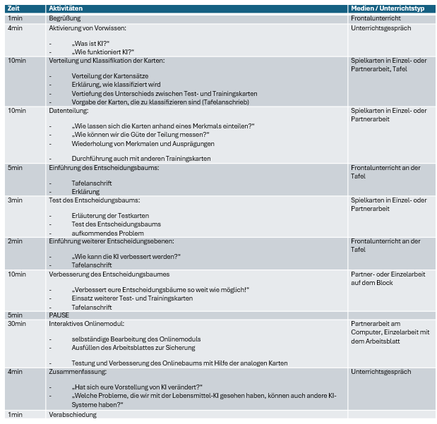 - Die Schülerinnen und Schüler erstellen mithilfe eines geeigneten digitalen Werkzeugs einen Klassifikator für eine gegebene Klassifikationsaufgabe (mittels des Onlinemoduls), analysieren mithilfe von Testdaten die Leistungsfähigkeit eines Klassifikators und bestimmen dessen Genauigkeit, erläutern mögliche, in den Trainingsdaten begründete Ursachen von Fehlklassifikationen (durch das Onlinemodul und die Karten zu Beginn) reflektieren Chancen (Leistungsfähigkeit) und Risiken (z.B. Konsequenzen von Fehlklassifikationen, Intransparenz) exemplarisch anhand eines Klassifikators (als Aufgabe des Arbeitsblattes).